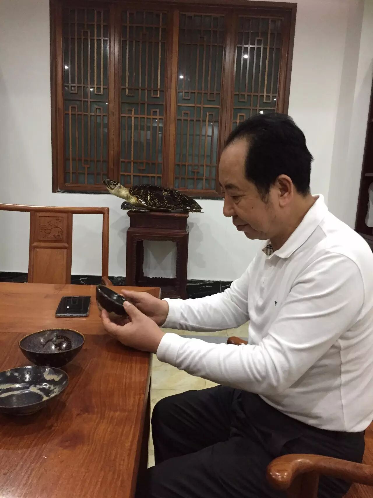 博物馆颜馆长颜盛繁先生与油画画家郑燕老师一起欣赏养护中的吉州窑茶盏