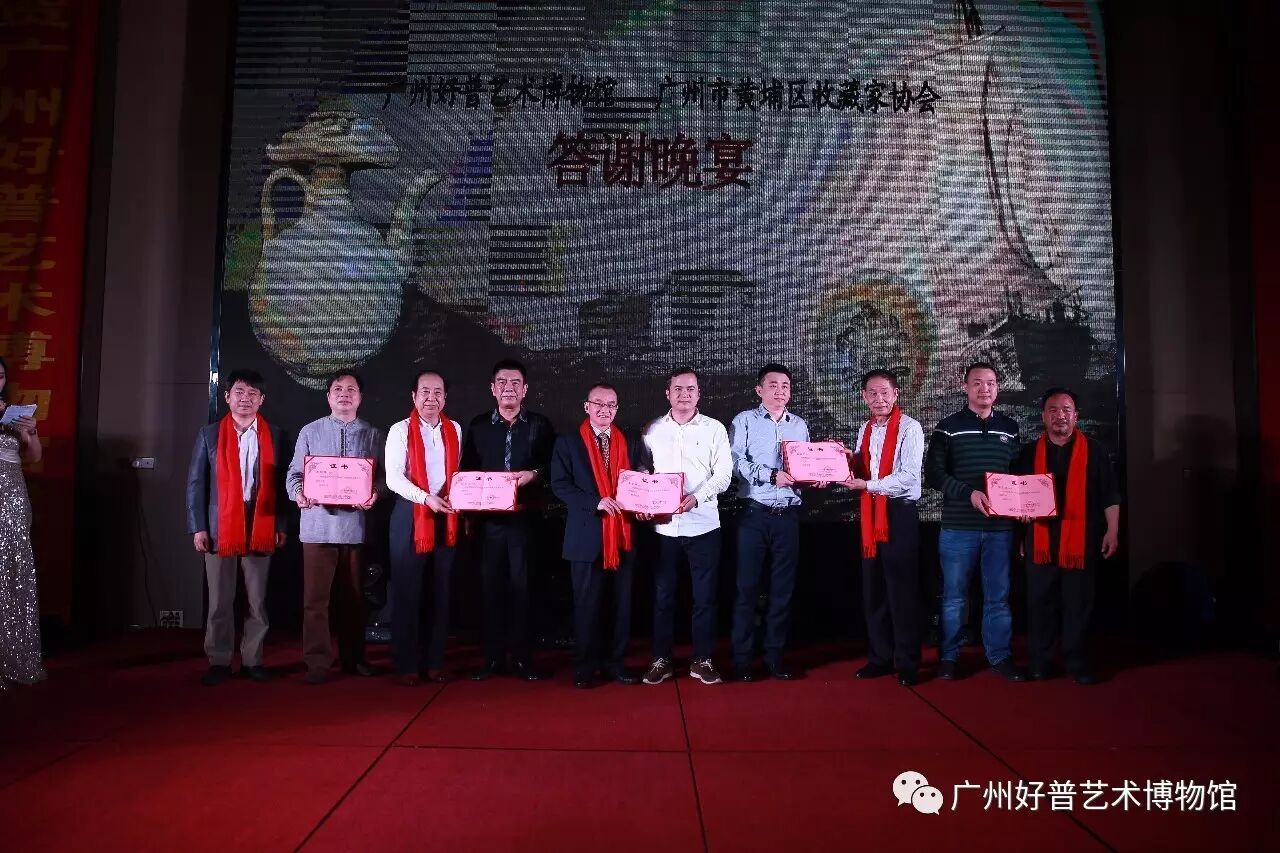 答谢晚宴上,协会名言会长赵伟国致答谢辞。在精彩的文艺氛围中,广州好普艺术博物馆终身名誉馆长、馆长、专家,广州市黄埔区收藏家协会专家顾问、副会长、监事长、秘书长、名誉会长、会长,均一一先后颁发证书。