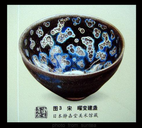 曜变盏(图3)是建窑的特异产品,非常难得,极为珍贵,它的主要特征是圆环状的斑点周围有一层干涉膜,在阳光照射下会呈现出蓝、黄、紫等不同色彩,并随观赏角度而变。