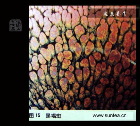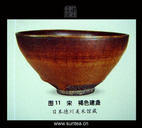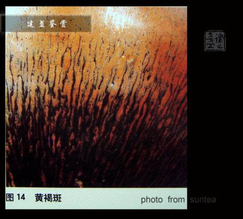 如果窑温过高,斑纹析出太多,太密,釉的底色被遮盖,也就成了褐色(图11),釉的底色仍是黑色。各种釉色,来源很复杂,要根椐迹象具体分析。如褐色釉,当黑釉釉层薄,或建盏釉过烧,或还原不足,或坯中氧化铁含量低,都可能出现。