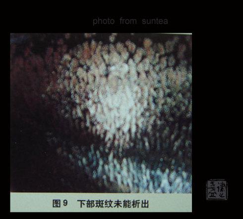 建盏釉层厚且流动性大。施厚釉是釉色的需要,釉色包括釉的底色和釉面斑纹。釉层太薄,釉不黑,釉薄处呈酱色。再则,釉层薄,兔毫斑纹短,不流畅。油滴(即鹧鸪斑)斑点也不大.,所以施厚釉是必要条件。但是,高温厚釉给建盏带来的缺陷是很难克服的。一是釉厚干燥收缩大,易使釉层开裂,与坯粘不紧,烧时易缩釉或脱釉。二是建盏在1300℃高温烧成,此时釉粘度降低,流动性增大,使釉层从上到下逐渐加厚,釉层厚度上下不均,对斑纹的形成影响很大。就兔毫来说,兔毫的斑纹好比水中的鱼草,在水浅处鱼草会被顶出水面,在水深处就沉在水中。所以兔毫斑纹一般在碗上部很密集并突出釉面,在下部较稀疏,沉在釉中,似隐似现(图8)。斑纹的浮沉程度不同,所受的氧化程度就不同,使得斑纹的形态和色彩都有所不同。斑纹形态和色彩的变化,从审美角度看似是好事,但实际变化的结果很难令人满意。往往是上部斑纹过密,下部斑纹过稀或无斑纹。或者是碗上部斑纹都变灰色了,下部斑纹还不能析出(图9)。宋徽宗赵佶在《大观茶论》中记载的:“盏色贵青黑,玉毫条达者为上”,指得是银色的兔毫,从上到下,流畅通达的为上品。