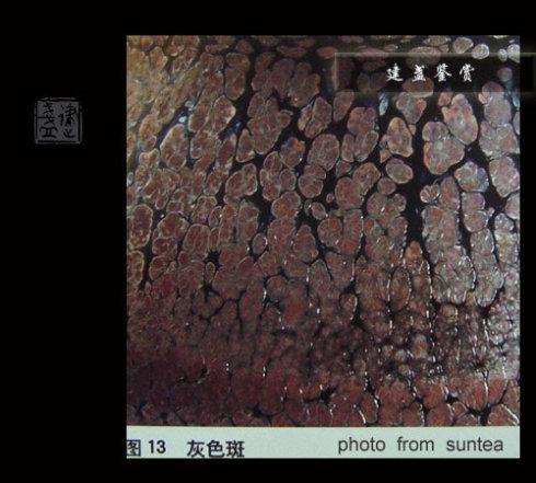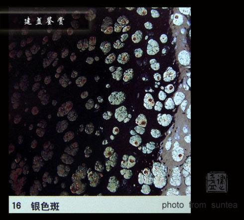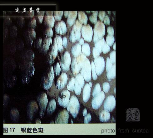优秀的银斑具有金属感,品质明显优于褐斑。国外也称金属陶瓷。但伴随银斑的是碍眼的劣质灰斑,而不是迷人的褐斑,而且银斑易消失,所以银斑形态与色彩的落差比褐斑(褐斑有偏黑或偏黄)大得多,整个碗中必有少数银斑被灰斑遮盖,或部分斑纹不清晰,似隐似现。如果细看,一个银色斑点(图17)中各部分就很不均匀,有银色,灰色,银蓝色等,而且有些部位突出釉面,有些部位沉入釉中,所以有毛刺感。有褶皱。斑点的形态与色彩无法完整显现。