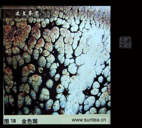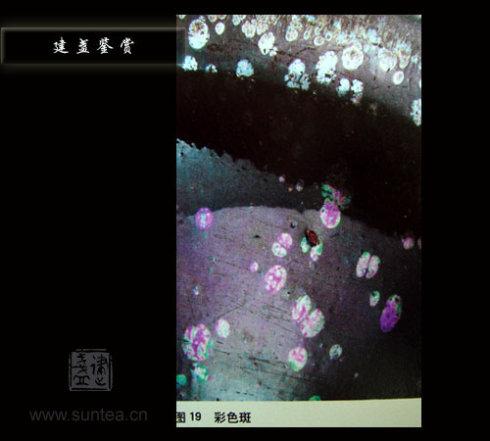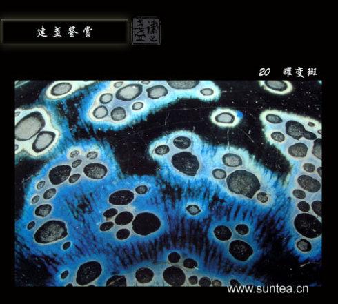 这个拂灰尘的工艺过程和北宗神秀的偈语相符。“身是菩提树,心如明镜台。时时勤拂拭,莫使惹尘埃”。银色斑纹上的灰尘如同人心上杂念,一念未伏另一念就起。想擦亮明镜何其难,灰尘多少总要伴随。所以建盏中烧的再好的银斑也有少量灰斑相伴,而且有些斑点不清晰。而褐色斑纹比较均匀,倒看不出毛病。看来精美是相对的。笔者也从中感受到原来不存在本色,许多人认为自然色就是本色,可褐斑明明是垢。银色附近还有银蓝色(图17),金色(图18),彩色(图19)。曜变(图20)形成机理与银斑不同,所以它不是擦灰尘的问题,而是更深层次的斑纹。