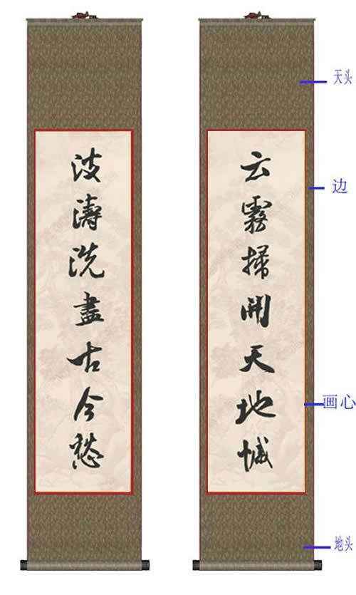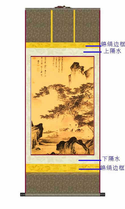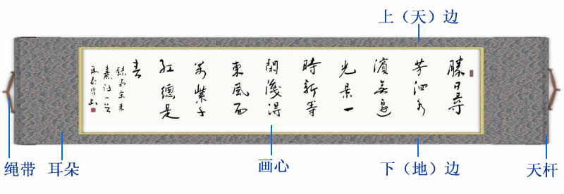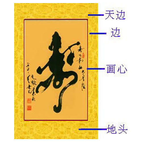 主要用于竖式构图,悬挂欣赏。画幅的上下左右常常有文人或收藏家题字赞赏。中间部分称“画心”,上有“诗塘”、“天头”,下是地脚。上下又有“隔水”,有的天头贴“惊燕”。