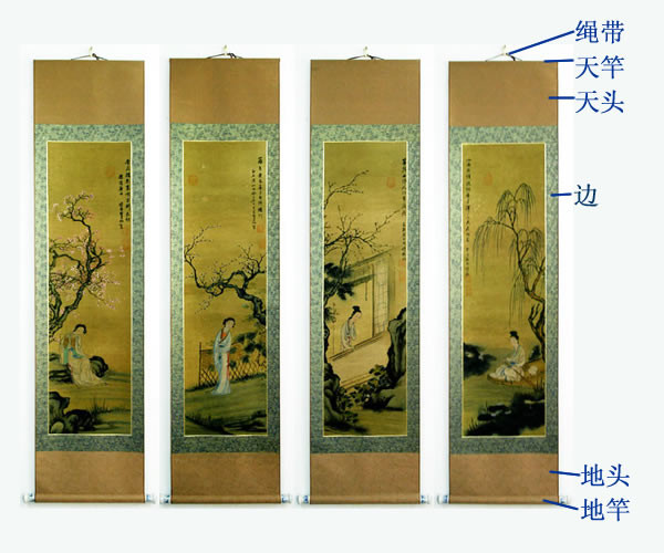 条屏画心由一色画绫等镶料装饰,排挂在一起。其形制与立轴一样,只是多了几幅,一般为4条,也有6条、8条、12条的。通景屏则由若干条尺寸相同、同空连贯的字或者画,分别由一色花绫等镶料装饰并排挂在一起。