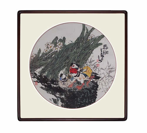 镜片亦称镜心,是托裱后的画心,适用于夹放在镜框内,故称镜心。其形式横、竖皆可,是一种简化了的立轴装裱形式,可装在镜框里悬挂欣赏。中国的镜框设计讲求简练,不重雕饰。(下三图)