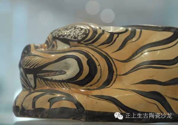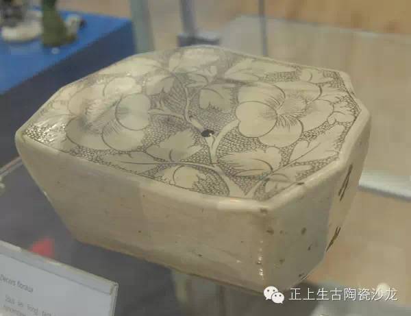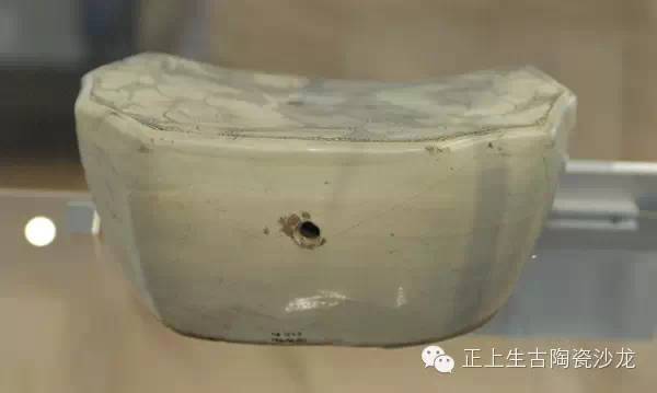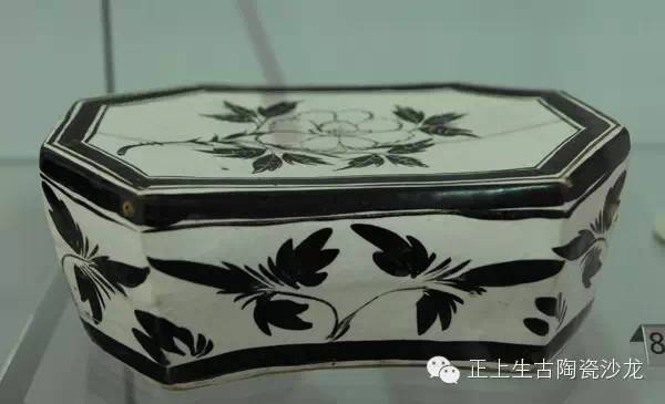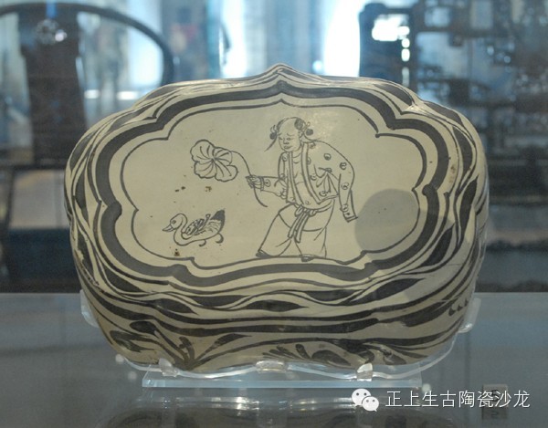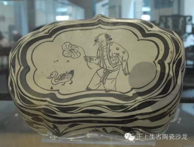 北宋·磁州窑白地黑花如意枕。磁州窑这类白地黑花的枕,最大看点就是枕面的画片了,题材丰富,生动谐趣。