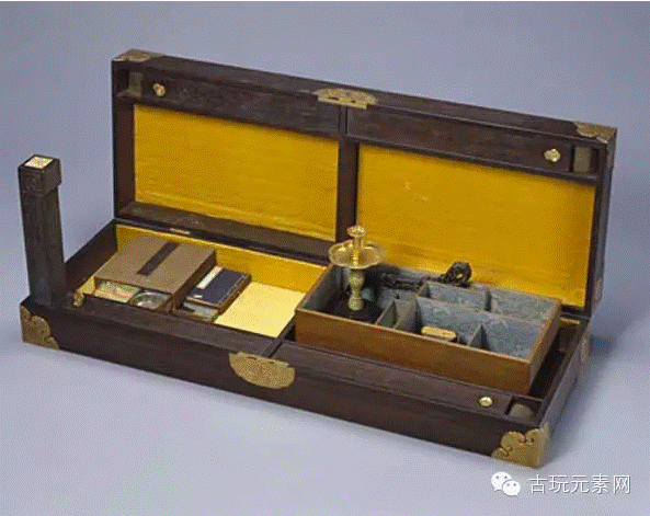明文震亨的《长物志》,也是一部记载文玩的著名文献,称文房诸具计有五十余种。随着社会和繁荣。到了清代,文玩的流行与繁荣,除了文人精心追求,营造一个窗明几净,赏心悦目的书斋环境外,另外在很大程度上,是清室康雍乾三朝皇帝的爱好与推动。如今在北京故宫博物院珍藏了一件乾隆御用旅行文具箱,是件绝无仅有的艺术精品。该箱紫檀木制作,箱长74厘米,高14厘米,宽29厘米,箱盖装有铜镀金暗锁。