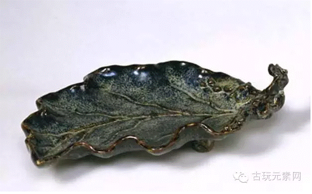 洗通体仿楸叶形,内外雕刻凹凸的叶脉,叶边堆贴4朵盛开的花,并刻出7枚花蕾。胎体厚重,釉层凝厚,深蓝色釉中渗化出葱白色雨点状花斑。此洗造型新颖,窑变花釉挥洒自如,卷曲的叶边仿佛被微风吹动,颇有天然韵致。石湾窑是利用当地自然资源制作陶瓷的古窑址,其窑变机理与宋代钧釉相同,但烧造出的窑变釉陶瓷的外观效果与宋代钧窑瓷器相去甚远,颇具浓郁的地方特色。石湾窑以蓝色为基调,而宋代钧窑之窑变釉则以紫红色为基调。从传世品看,石湾窑仿钧釉多为蓝色釉中夹杂白、红、紫等色,绚丽多彩,斑驳陆离,独树一帜。