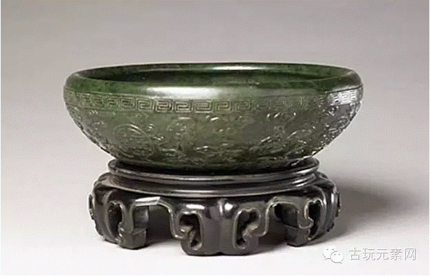 洗碧玉质,有黑斑。器圆形,口内敛,腹部线条圆润,下具四矮足。器腹近口处饰回纹一周,主题纹饰为云蝠纹和篆体团“寿”字。玉洗配紫檀如意云头木架。洗是战国晚期出现的一种青铜器,用于日常的盥洗,形体都比较大。宋代以后,瓷洗成为常见的生活用品。故宫博物院藏有若干件清代早中期烧造的瓷洗,品种各异。此洗显然仿瓷洗而制,这种玉洗已脱离了盥洗的作用而成为文房用品中的笔洗。