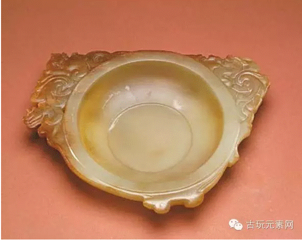 此器玉料为青色,圆形,内膛很浅,可贮水。口沿宽而平,两侧横出片状柄,左侧柄饰龙、螭,螭头似虎而有角,身自云水中隐没,龙隐于螭后,仅露头,头形似熊。右侧柄装饰一长身龙,独角,身亦隐于云水中。柄的背面为阴线刻的图案,与正面图案近似。 中国文化在汉代有了很大的发展,书、画勃兴,文房用具出现了很多新品种。目前已发现的汉代文房玉器有砚滴、笔屏等。此作品内膛较浅,口又阔,应是文房用品中的笔洗。